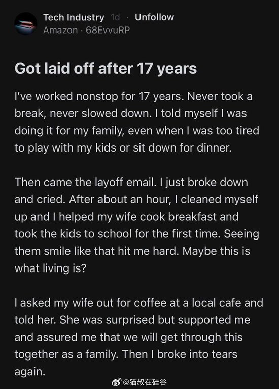 「自己连续工作了 17 年。从未休息,从未放慢脚步。我告诉自己,我是为了家人。然后裁员邮件来了。我彻底崩溃,哭了。一个小时后,我收拾好自己,帮妻子做早餐,第一次送孩子们上学。看到他们笑得那么开心,真的很震撼我。也许,这才是生活?」