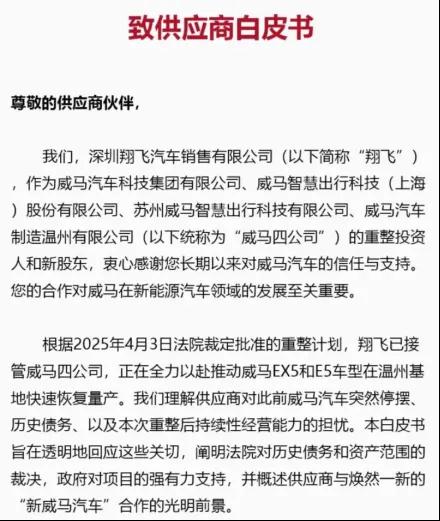 2025 年 9 月份,深圳翔飞汽车销售有限公司正式接管了威马四家核心公司,与此同时还发布了 《致供应商白皮书》,推出复活计划,深圳翔飞投资 10 亿元。