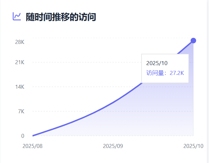 GrsAi APi 是在 2025 年 4 月 13 日上线,通过朋友介绍获得了一个大客户,就开始专注于这个 Api 产品。运营了大半年从最开始的几百访问量,到 8k 九月的 9.49k,10 月甚至达到了 27.2k,这意味着,在刚刚过去的一个月里,我的个人项目 GrsAi API 平台 (https://grsai.com/) 访问量实现了近三倍的暴涨。