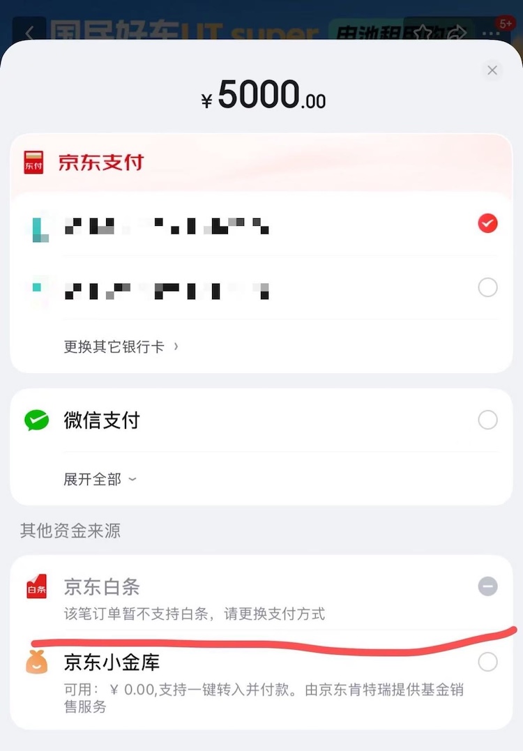 蓝鲸汽车记者在京东 APP 搜索 「国民好车」 后,目前有两个选项可选:支付 5 千元定车 (下定锁单不可退)、支付 500 元意向金预约试驾 (可退)。