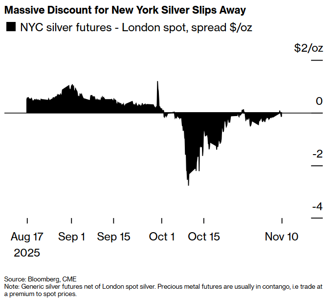 今年早些时候,由于关税担忧引发白银大量流向纽约,伦敦白银库存曾跌至历史低点。当 10 月初印度需求激增及白银支持交易所交易基金 (ETF) 的申购潮冲击市场时,剩余白银已不足以满足需求,推动基准现货价格较其他市场每盎司高出 3 美元。