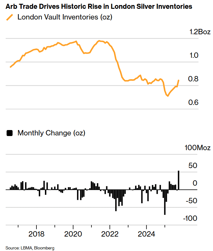 伦敦金库在 10 月份增加了近 5400 万盎司白银,其重量超过 100 辆英国首都标志性双层巴士的总和。这批白银被历史性套利机会吸引至伦敦,这种套利机会由市场紧俏引发,同时抽走了其他地区的仓库库存。