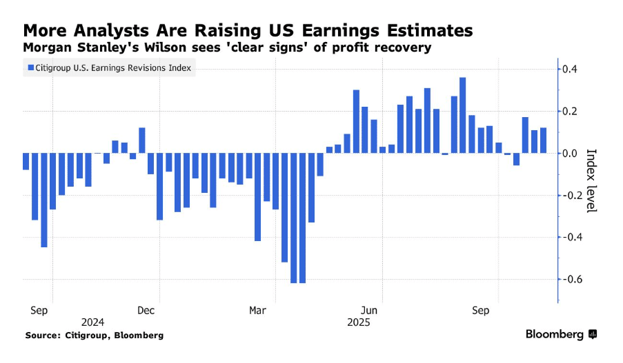 花旗集团 (Citigroup Inc.) 的一项指数显示,自 10 月中旬以来,上调盈利预期的分析师数量超过了下调预期的分析师。目前市场焦点转向下周英伟达 (NVDA) 的财报,以期获取人工智能行业趋势的线索。