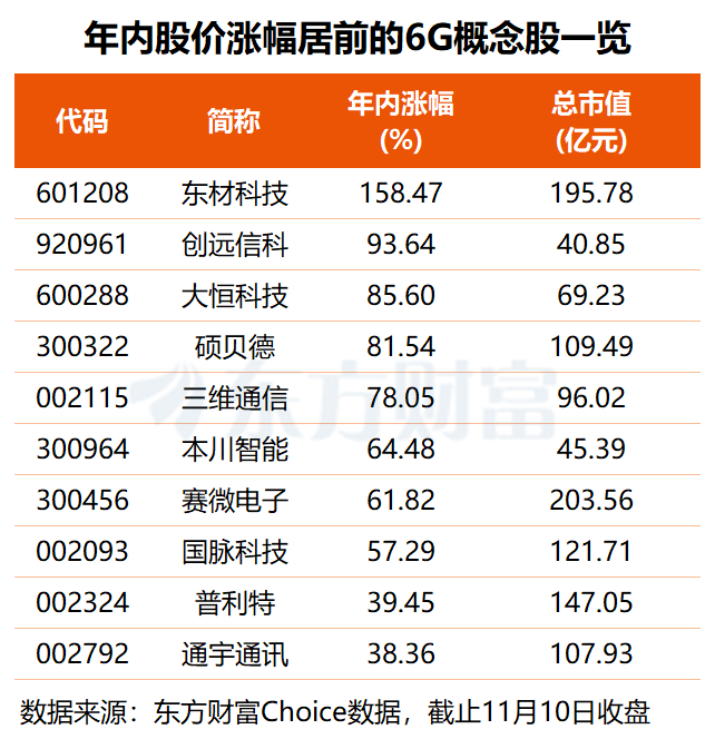 二级市场表现方面,6G 概念板块指数年内上涨近四成,相关概念股中,共有东材科技、创远信科、大恒科技、硕贝德、三维通信、本川智能、赛微电子、国脉科技等 8 股涨幅超 50%,其中,东材科技年内大涨 158.47%,领涨 6G 概念板块;创远信科、大恒科技、硕贝德区间涨幅均超 80%。