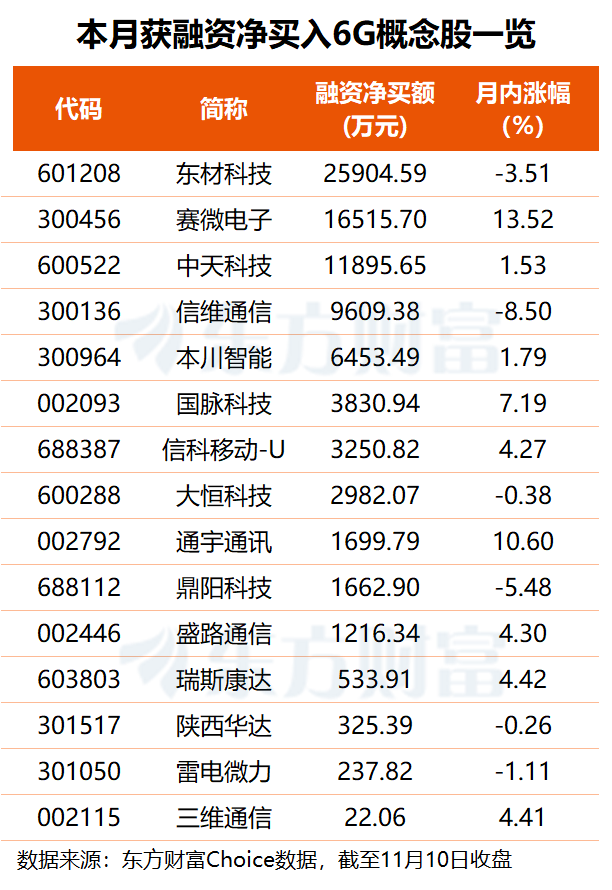 杠杆资金方面,进入 11 月以来,共有 15 只 6G 概念股获融资净买入,东材科技、赛微电子、中天科技的融资净买额分别为 2.59 亿元、1.65 亿元和 1.19 亿元,信维通信获融资客抢筹 9609 万元。在这 15 股中,赛微电子月内涨幅超 13%,通宇通讯亦涨超 10%,获杠杆资金大幅加仓的东材科技、信维通信分别下跌 3.51% 和 8.5%。