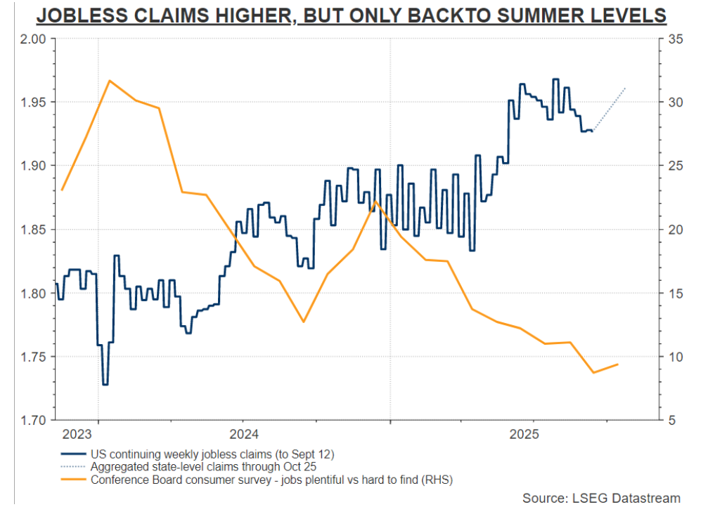 因此,除非即将发布的延迟数据出现重大意外,否则今年第三次降息的合理性正快速减弱。尽管期货市场仍定价 12 月再次降息的概率约为三分之二,但这很可能被证明过于乐观。