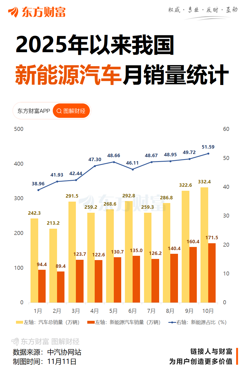 中国汽车工业协会今天 (11 日) 发布的最新数据显示,今年 1 至 10 月份,我国新能源汽车产销量继续实现较高增长。其中,10 月份新能源汽车月度新车销量首次超过了汽车新车总销量的 50%。