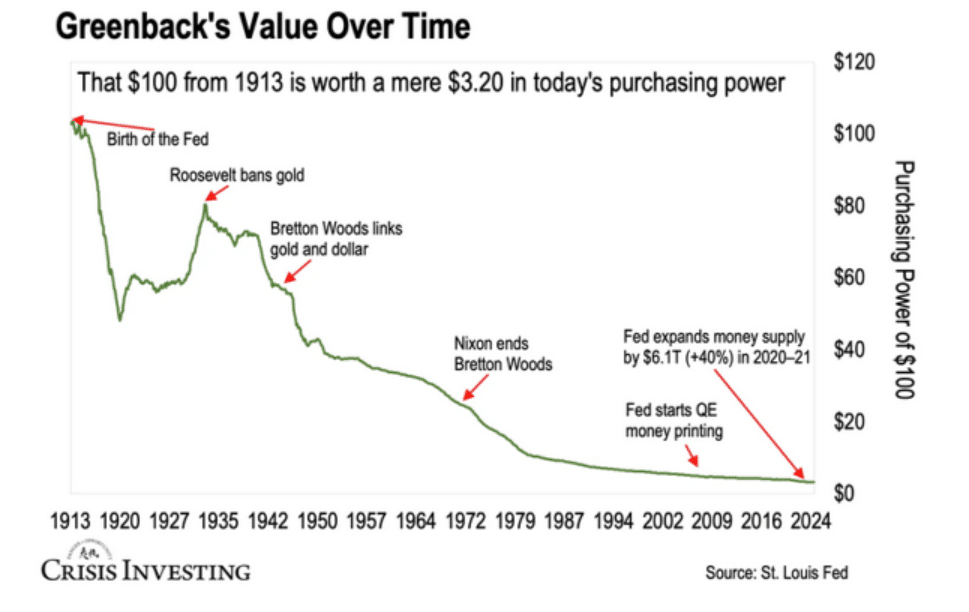以下图表准确显示了美联储政策对美元价值的影响 。鉴于当前的情况,它比以往任何时候都更具现实意义。自 1913 年美联储成立以来,美元已失去了惊人的 97% 的购买力。1913 年的 100 美元,如今仅值 3.20 美元。