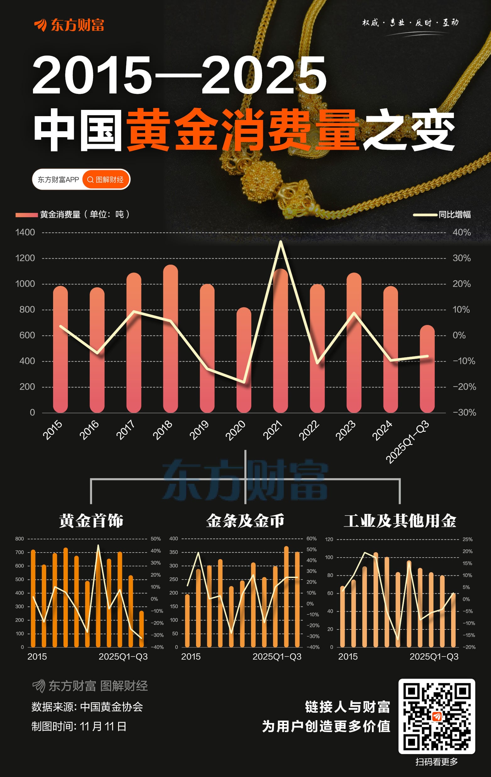 11 月 10 日,中国黄金协会发布的数据显示,2025 年前三季度,我国黄金消费量 682.73 吨,同比下降 7.95%。其中,下降最多的是消费黄金首饰,前三季度同比下降 32.50%。但不同品类表现分化显著。同期,金条、金币、工业及其他用金都出现不同程度的增长,尤其是金条及金币同比增长 24.55%。