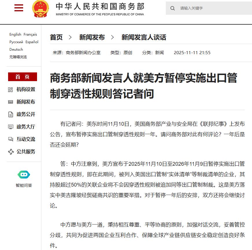 有记者问:美东时间 11 月 10 日,美国商务部产业与安全局在 《联邦纪事》 上发布公告,宣布暂停实施出口管制穿透性规则一年。请问商务部对此有何评论?一年后是否还会延期?