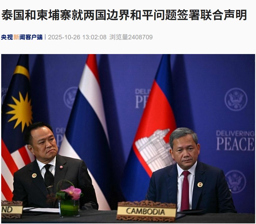 据央视新闻此前消息,当地时间 10 月 26 日,泰国和柬埔寨就两国边界和平问题在马来西亚吉隆坡签署联合声明。