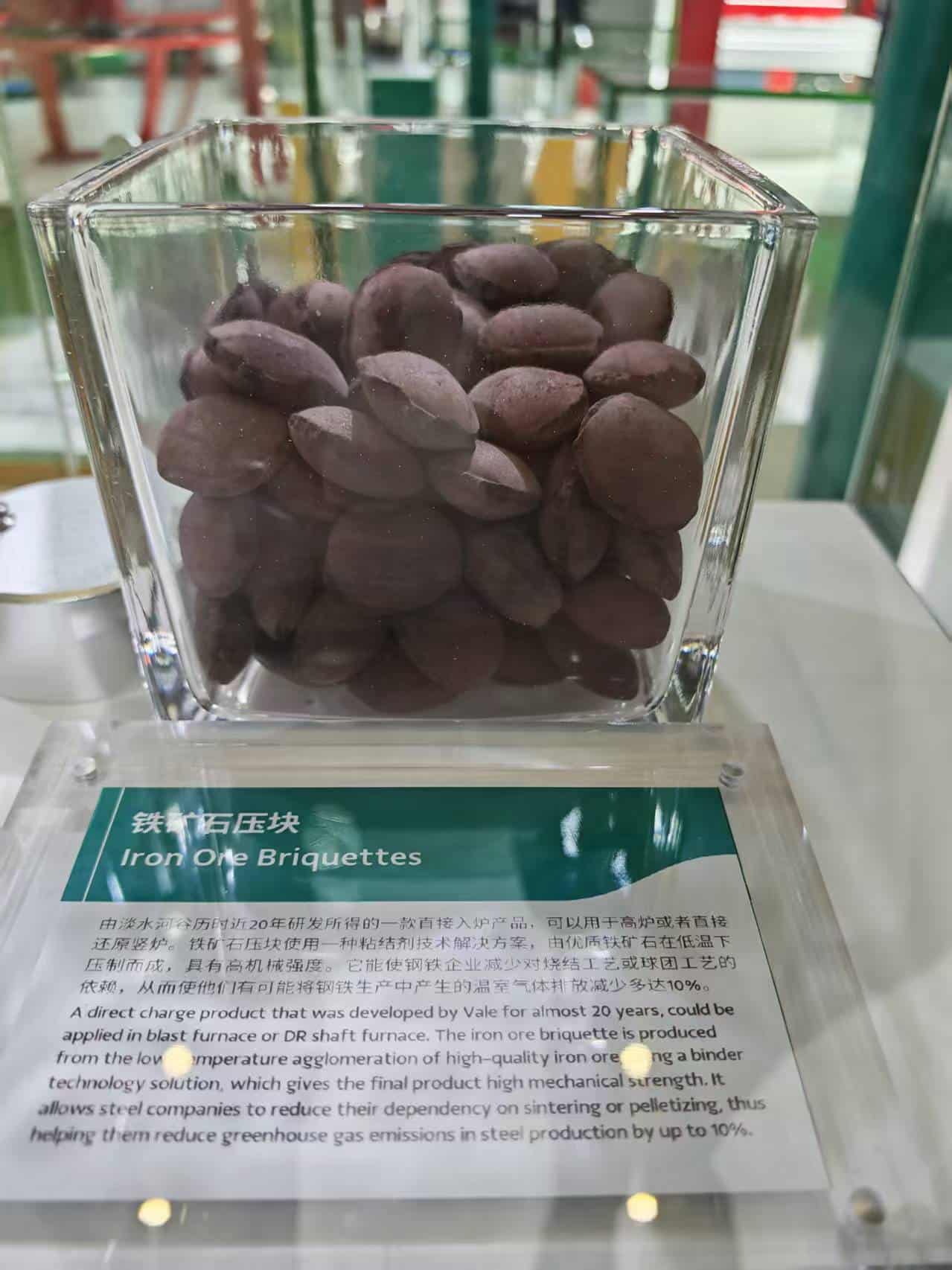 展台上陈列着形如话梅核的铁矿石压块,是淡水河谷历时近 20 年研发而成的直接入炉产品。它采用专属粘结剂技术,以优质矿粉在低温下压制成型,机械强度高,或能帮助钢铁企业将炼钢过程中的温室气体排放降低至多 10%,成为绿色转型中的一大亮点。