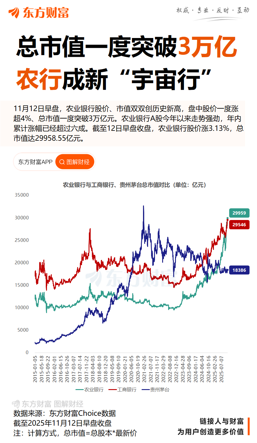 农业银行持续拉升涨超 3%,总市值突破 3 万亿元,再创历史新高。