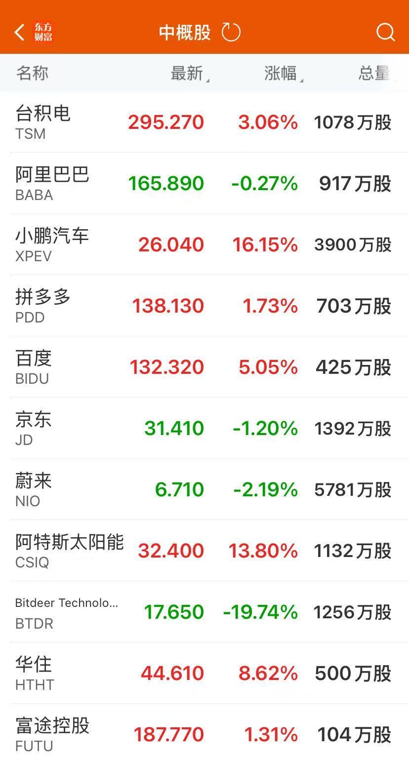 热门中概股普涨,纳斯达克中国金龙指数收涨 2.25%,小鹏汽车涨超 16%,百度涨超 5%,老虎证券、微博涨超 3%,爱奇艺涨超 2%,拼多多涨超 1%。