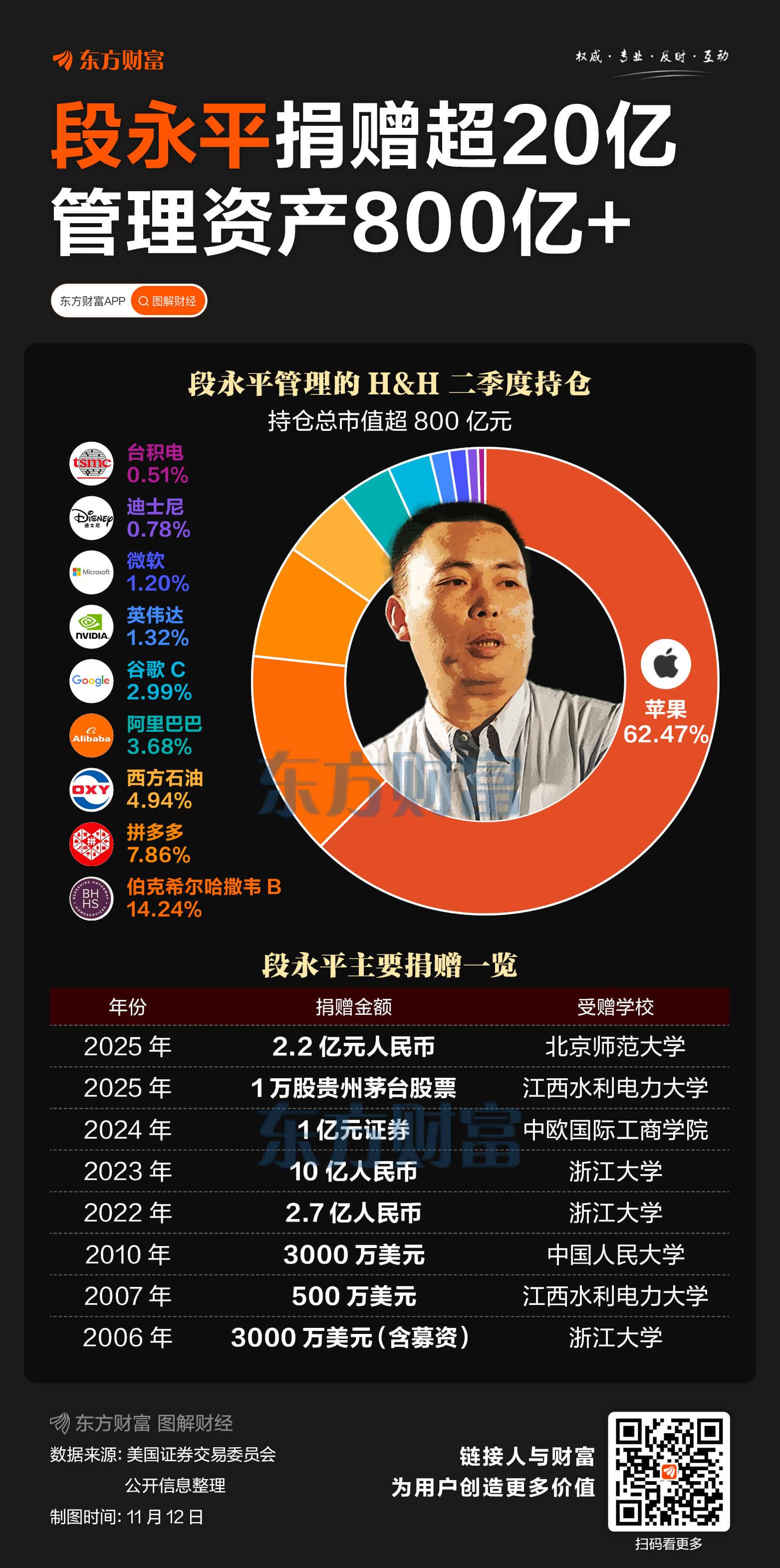 就其本人资产来看,2025 年 3 月,段永平以 100 亿人民币财富位列 《胡润全球富豪榜》 榜单 2575 位。而根据美国证券交易委员会披露的数据,2025 年 6 月 30 日,段永平管理的投资机构 H&H International Investment 的持仓总市值为 115 亿美元,约为 800 多亿人民币。其持仓共有十只股票,前三位分别为苹果(62.47%)、伯克希尔哈撒韦 B 股(14.24%) 和拼多多(7.86%),前三位占比接近 85%。
