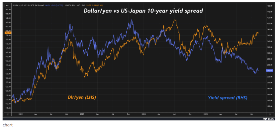 尽管如此,美元兑日元与美日债券收益率利差之间的紧密相关性已完全破裂,这表明日元可能处于异常疲软状态。瑞穗 (Mizuho) 分析师表示,当前利差对应的美元兑日元汇率应低于 145。