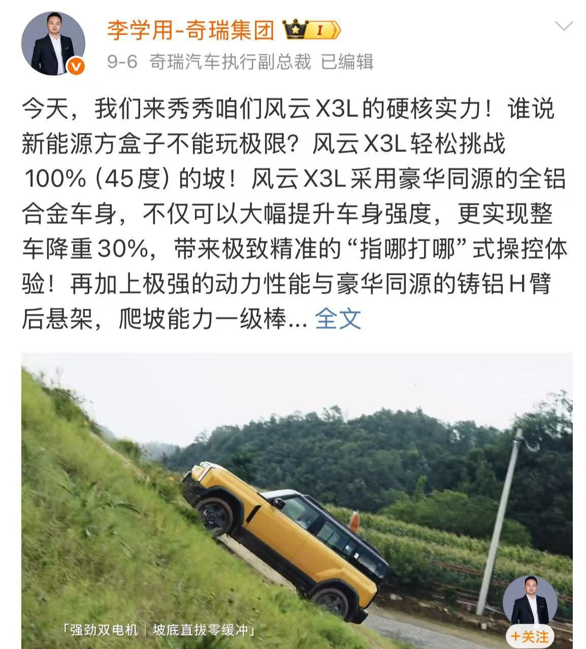 与此同时,在奇瑞汽车的营销宣传工作之中,「性能」「安全」 相关内容是其重点宣传的标签之一。在奇瑞汽车执行副总裁李学用的社交平台上,就发布了不少有关车辆测试的内容。