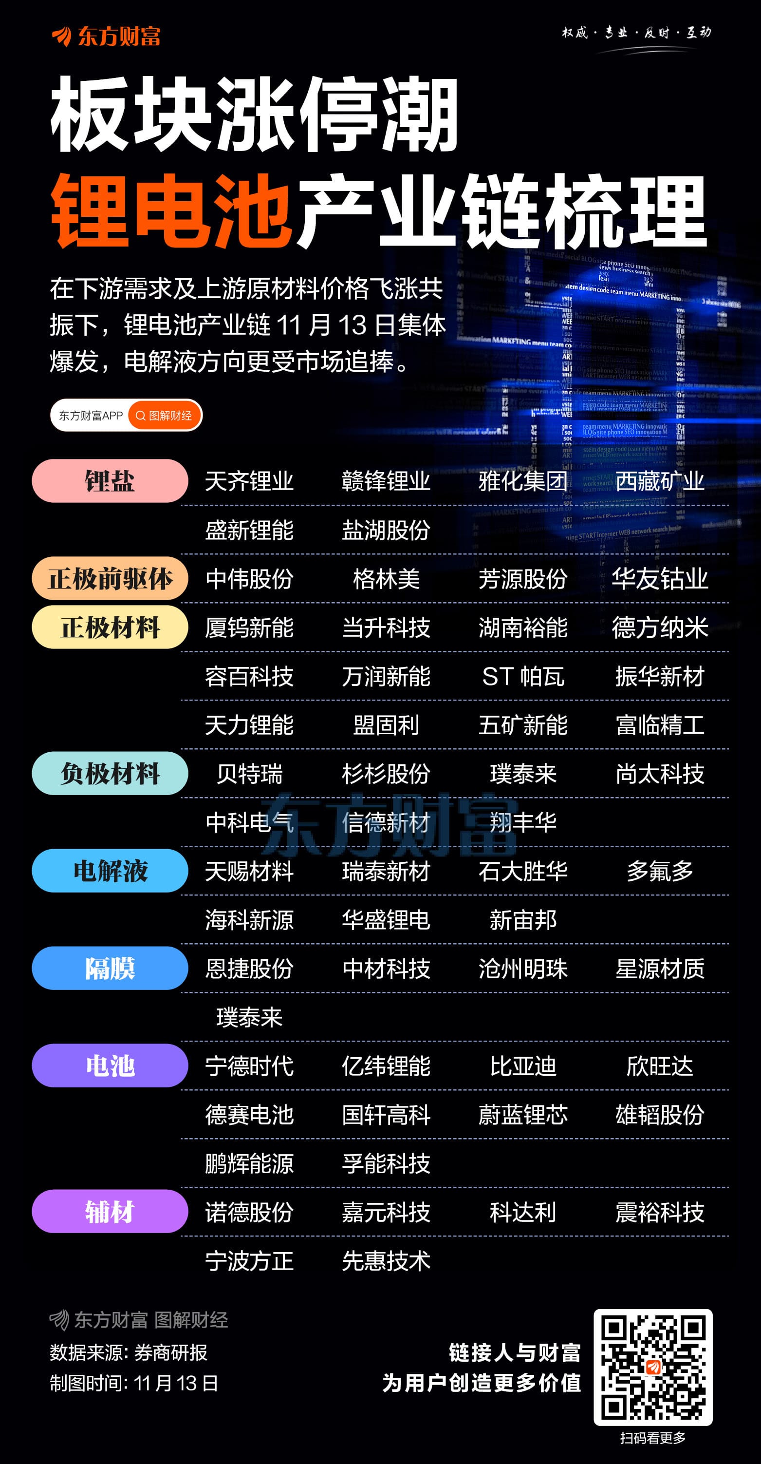 锂电池概念 11 月 13 日掀起涨停潮,当天收盘时,富祥药业、康鹏科技、海科新源、华盛锂电、泰和科技等 27 股涨停。天宏锂电、天华新能等 12 股则大涨超 10%。