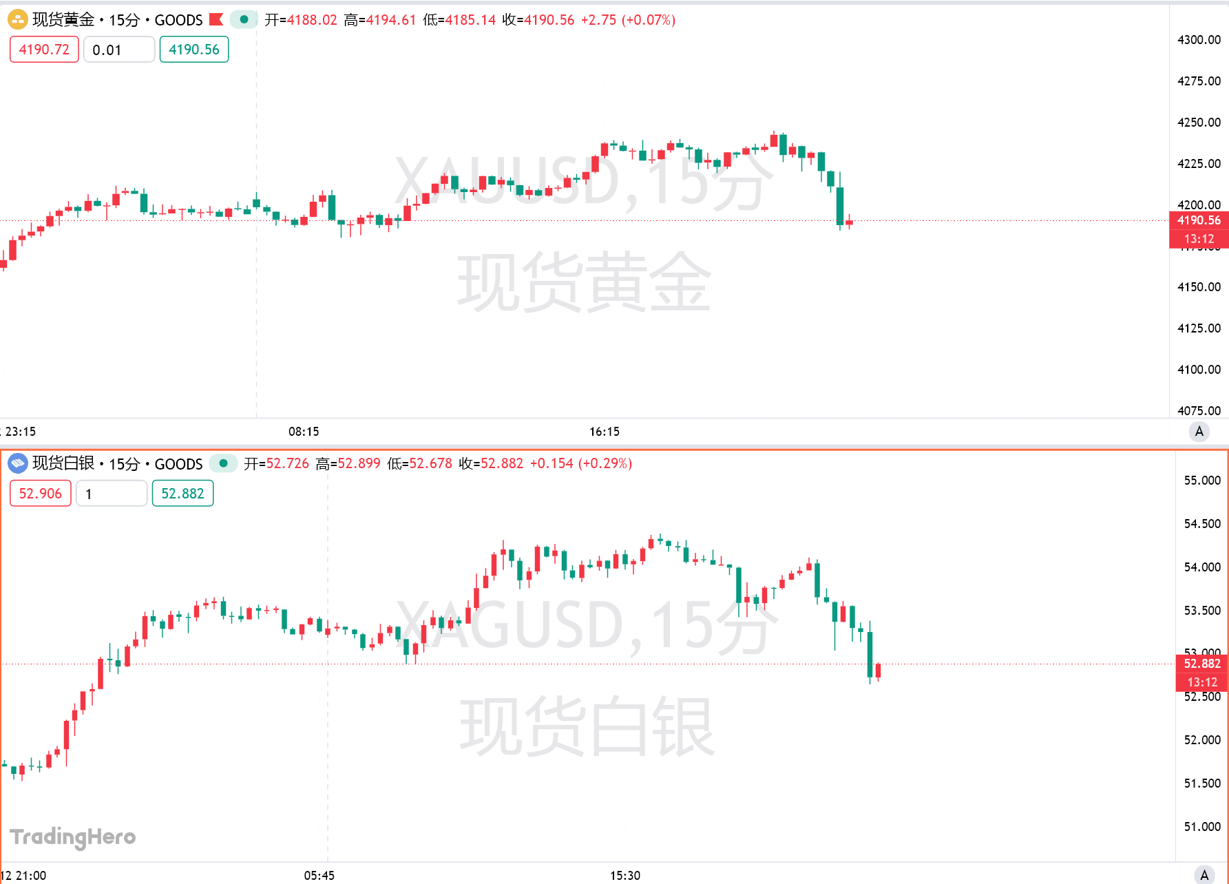 周四美盘初,现货黄金回吐日内涨幅,短线走低 16 美元,一度逼近 4180 美元/盎司;现货白银日内转为下跌 1%,失守 53 美元/盎司。