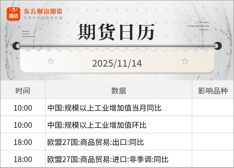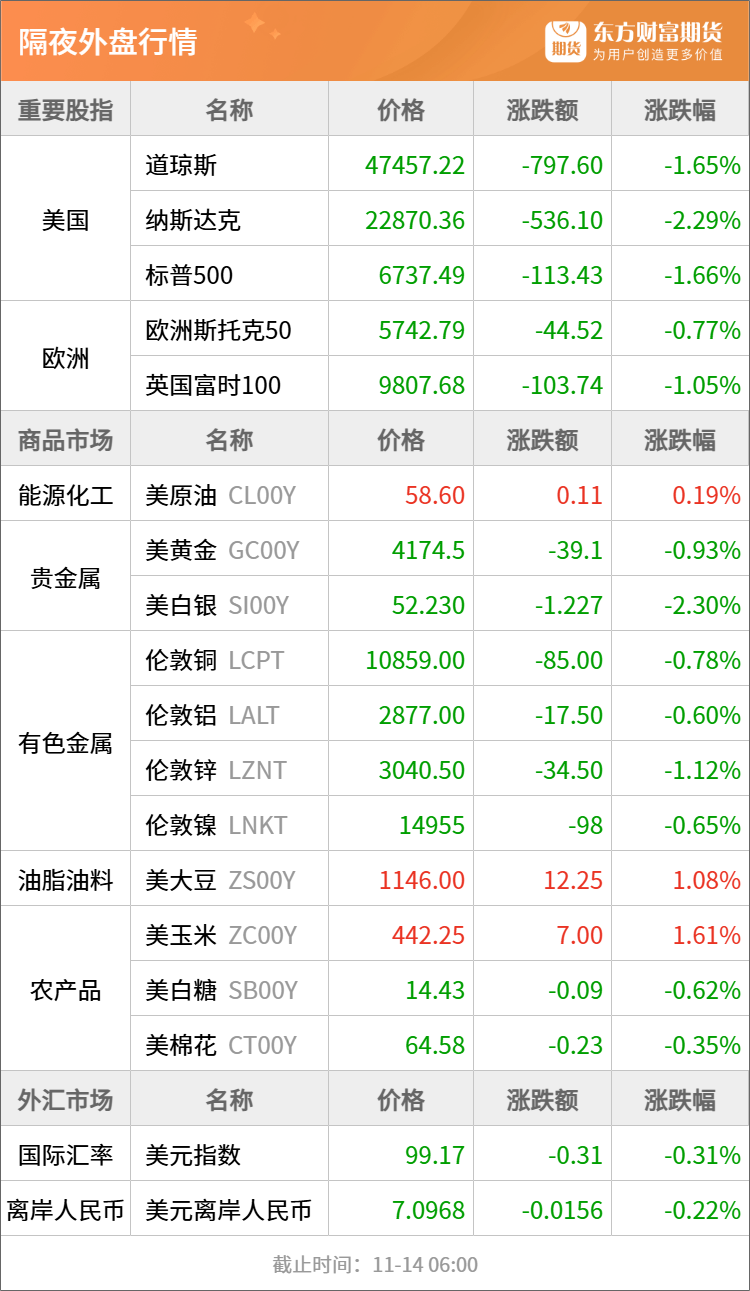 钢材:截至 11 月 13 日当周,螺纹钢产量、表需连续两周下降,厂库、社库连续五周下降。螺纹产量 200 万吨,较上周减少 8.54 万吨,降幅 4.1%;螺纹厂库 160.42 万吨,较上周减少 6.42 万吨,降幅 3.85%;螺纹社库 415.75 万吨,较上周减少 9.95 万吨,降幅 2.34%;螺纹表需 216.37 万吨,较上周减少 2.15 万吨,降幅 0.98%。(Mysteel)