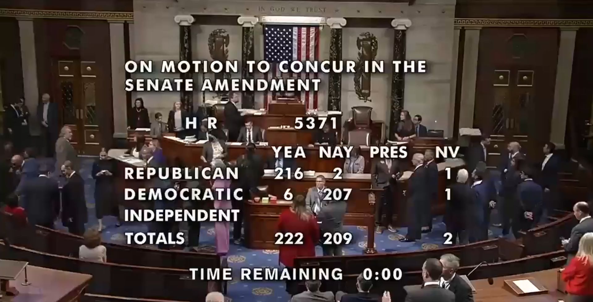 当天,众议院最终以 222 票支持、209 票反对的结果通过该法案。该法案将为联邦政府提供持续拨款,使大部分政府机构获得运作资金直至 2026 年 1 月 30 日。