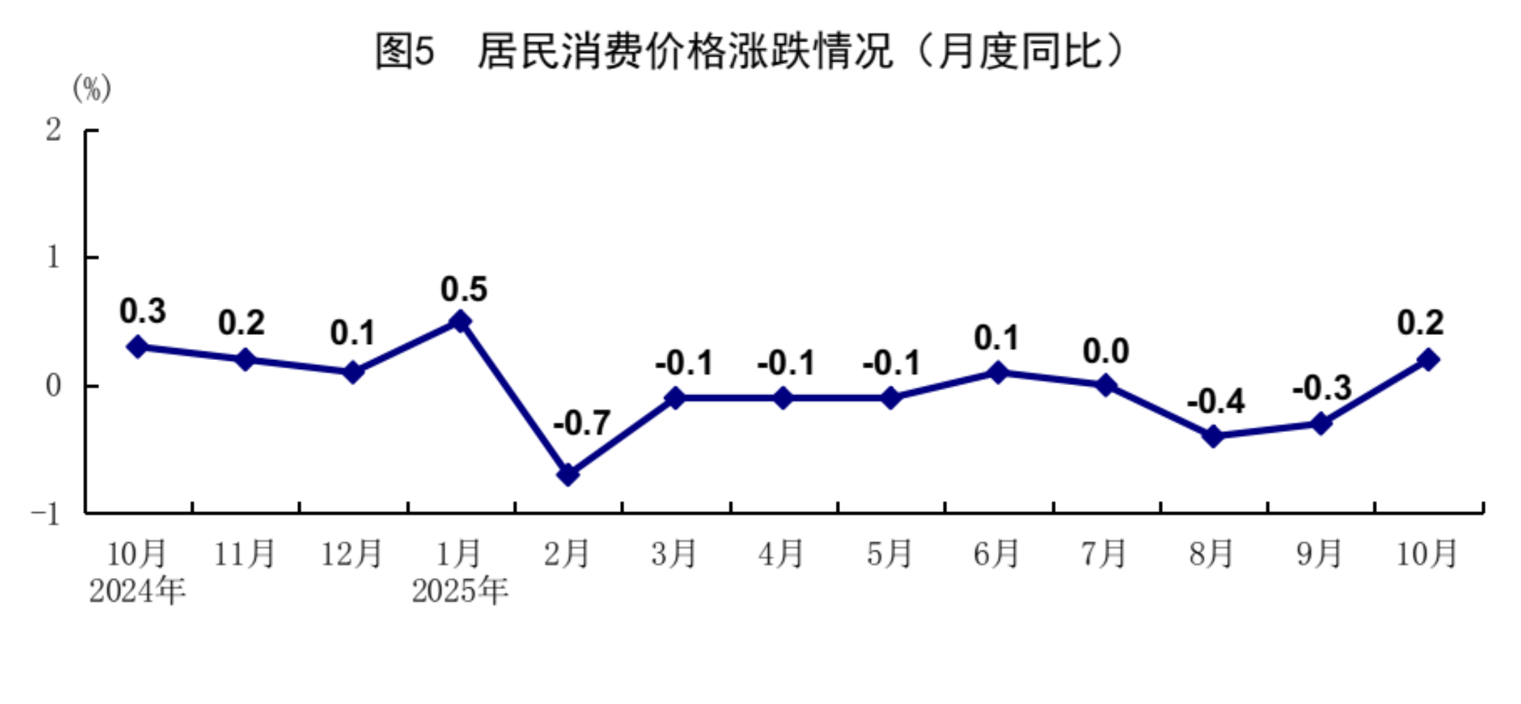 10 月份,全国居民消费价格 (CPI) 同比上涨 0.2%,上月为下降 0.3%;环比上涨 0.2%。分类别看,食品烟酒价格同比下降 1.6%,衣着价格上涨 1.7%,居住价格上涨 0.1%,生活用品及服务价格上涨 1.9%,交通通信价格下降 1.5%,教育文化娱乐价格上涨 0.9%,医疗保健价格上涨 1.4%,其他用品及服务价格上涨 12.8%。在食品烟酒价格中,猪肉价格下降 16.0%,鲜菜价格下降 7.3%,鲜果价格下降 2.0%,粮食价格下降 0.7%。扣除食品和能源价格后的核心 CPI 同比上涨 1.2%,涨幅比上月扩大 0.2 个百分点。1-10 月份,全国居民消费价格同比下降 0.1%。