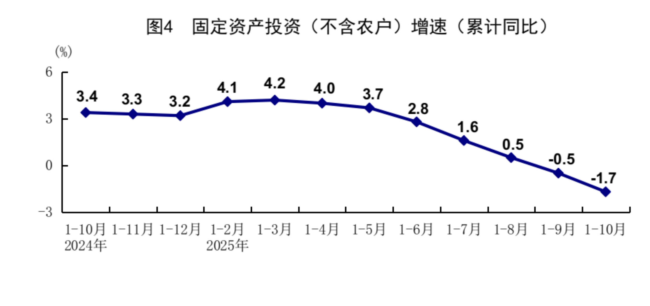1-10 月份,全国固定资产投资 (不含农户)408914 亿元,同比下降 1.7%;扣除房地产开发投资,全国固定资产投资增长 1.7%。分领域看,基础设施投资同比下降 0.1%,制造业投资增长 2.7%,房地产开发投资下降 14.7%。全国新建商品房销售面积 71982 万平方米,同比下降 6.8%;新建商品房销售额 69017 亿元,下降 9.6%。分产业看,第一产业投资同比增长 2.9%,第二产业投资增长 4.8%,第三产业投资下降 5.3%。民间投资同比下降 4.5%;扣除房地产开发投资,民间投资增长 0.2%。高技术产业中,信息服务业,航空、航天器及设备制造业,计算机及办公设备制造业投资同比分别增长 32.7%、19.7%、4.1%。10 月份,固定资产投资 (不含农户) 环比下降 1.62%。