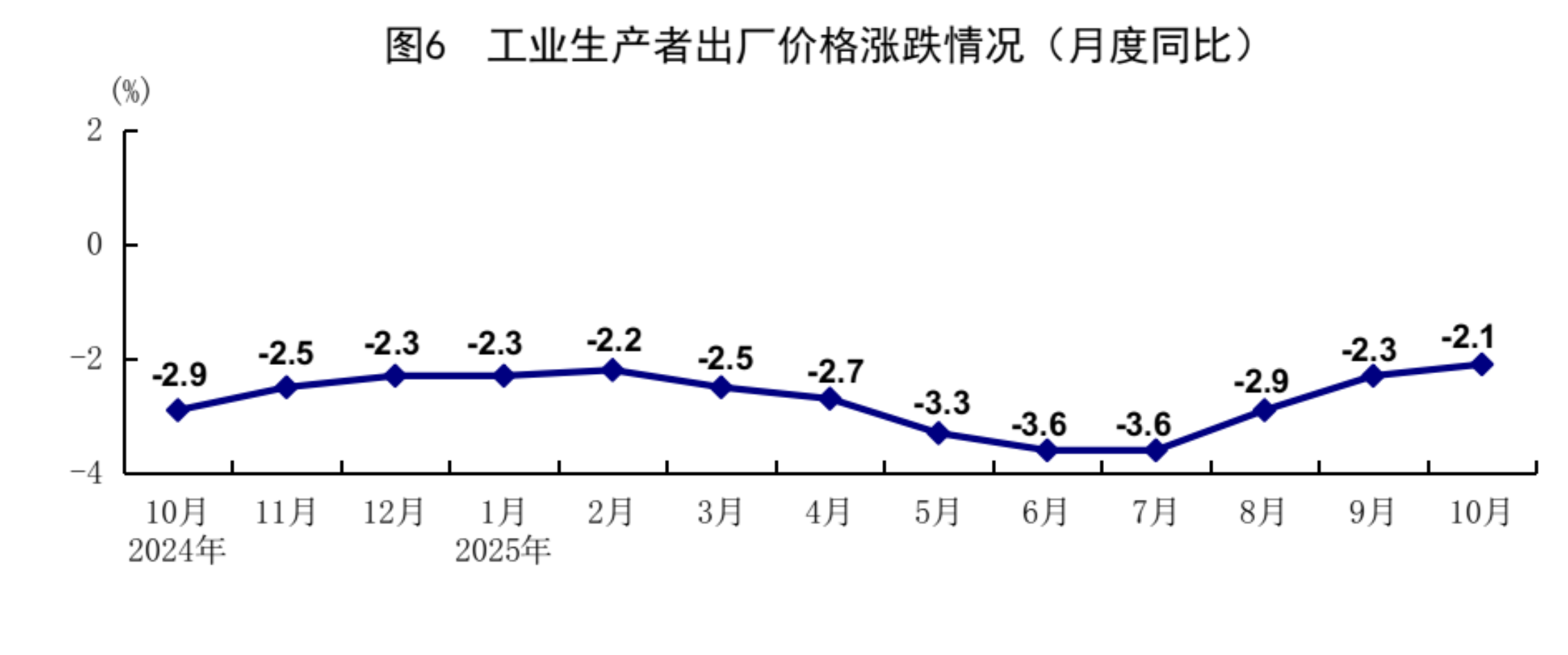 10 月份,全国工业生产者出厂价格同比下降 2.1%,降幅比上月收窄 0.2 个百分点,环比上涨 0.1%;全国工业生产者购进价格同比下降 2.7%,降幅收窄 0.4 个百分点,环比上涨 0.1%。1-10 月份,全国工业生产者出厂价格和购进价格同比分别下降 2.7%、3.2%。