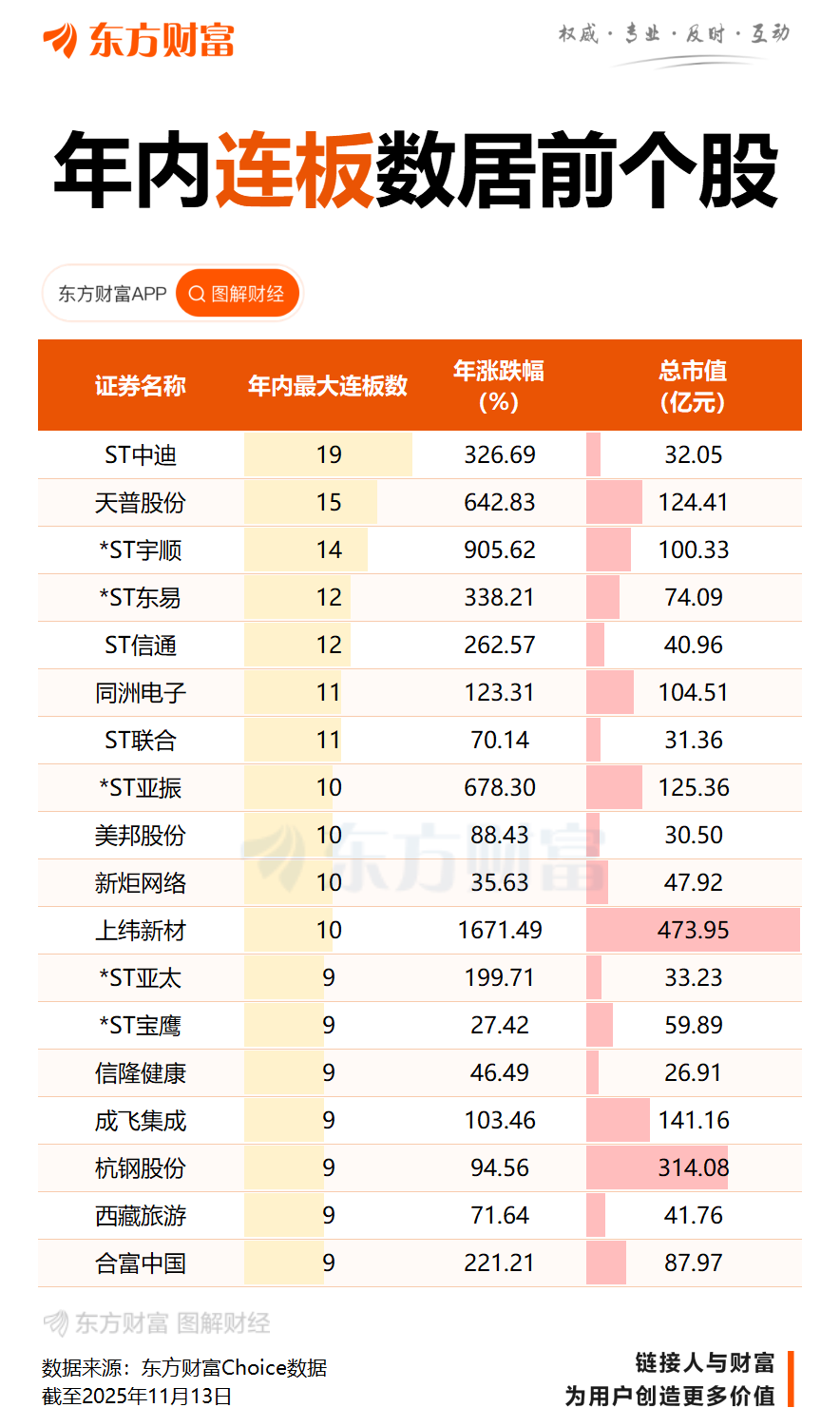 自 9 月 29 日以来,*ST 东易在 28 个交易日取得 23 个涨停。截至 11 月 13 日,公司股价报 17.66 元/股,总市值为 74.09 亿元。