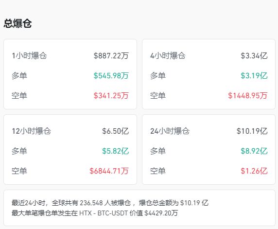 CoinGlass 数据显示,24 小时加密货币市场超 23 万人被爆仓,爆仓总金额为 10.19 亿美元 (约合人民币 72 亿元),最大单笔爆仓发生在 HTX-BTC-USDT,价值 4429.2 万美元。