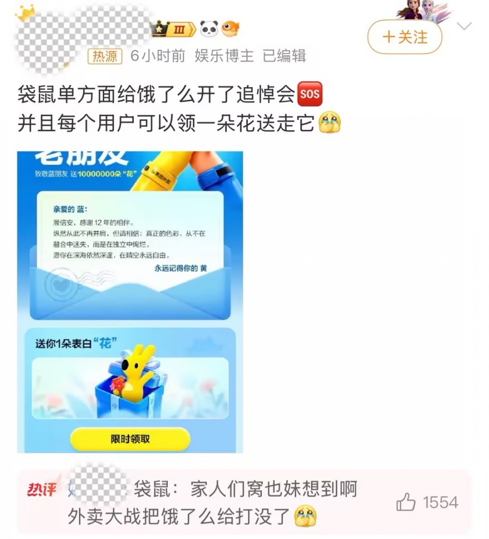 网友锐评,「袋鼠单方面给饿了么开了追悼会,并且每个用户可以领一朵花送走它」「本来以为是正经告别,结果送的不是真花,是鸡米花鲜花饼,甚至五花肉、花生米,真是人家秋雅结婚,你搁这又唱又跳!不过这波也算是和平分手叭,还送分手礼」「奶奶,这是你爱磕的宿敌」「真实的商战就是这么朴实无华」……