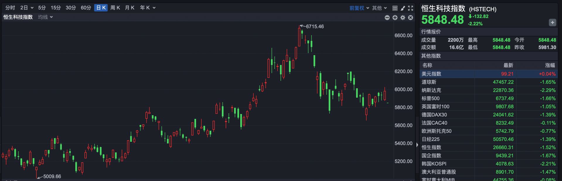 恒生科技指数报 5848.48 点,下跌 132.82 点,跌幅 2.22%。