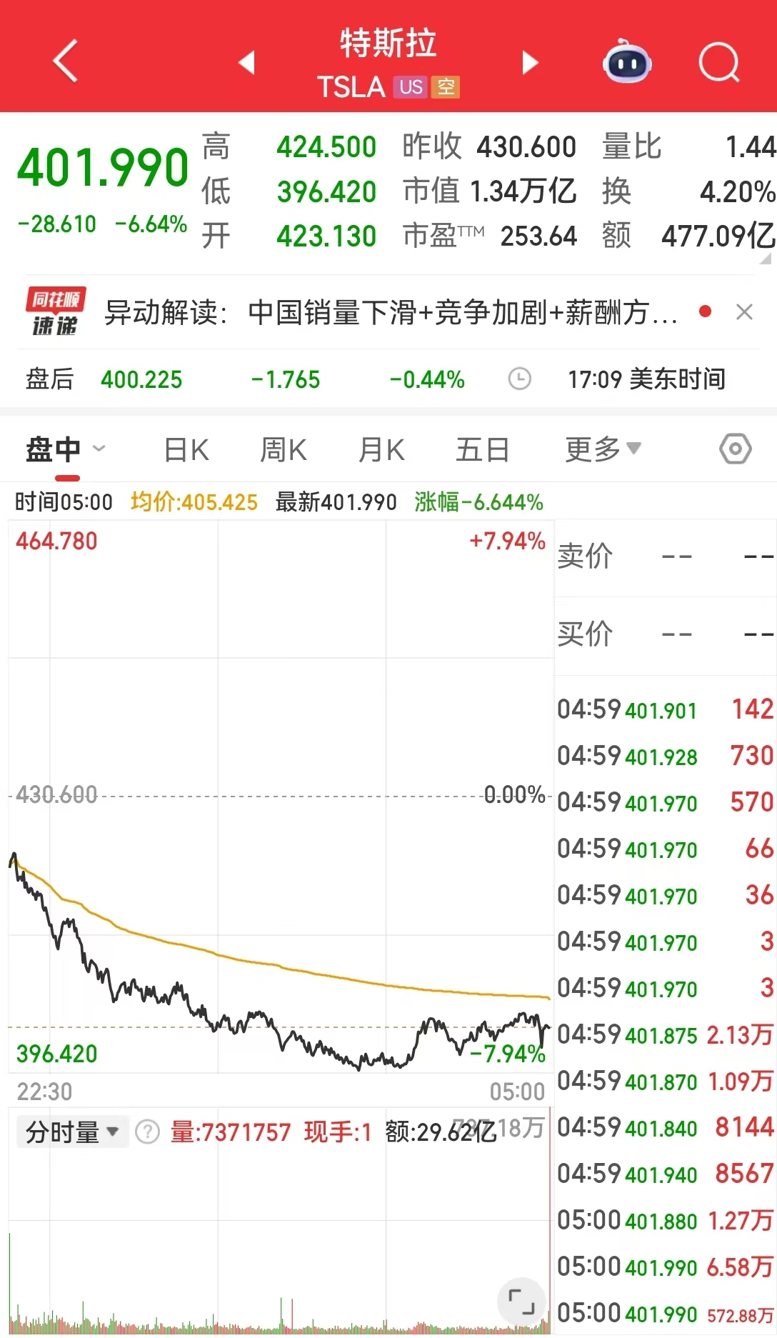 截至当地时间 11 月 13 日美股收盘,特斯拉报 401.99 美元,跌幅 6.64%,其市值一夜蒸发 952 亿美元 (约合人民币 6755 亿元)。