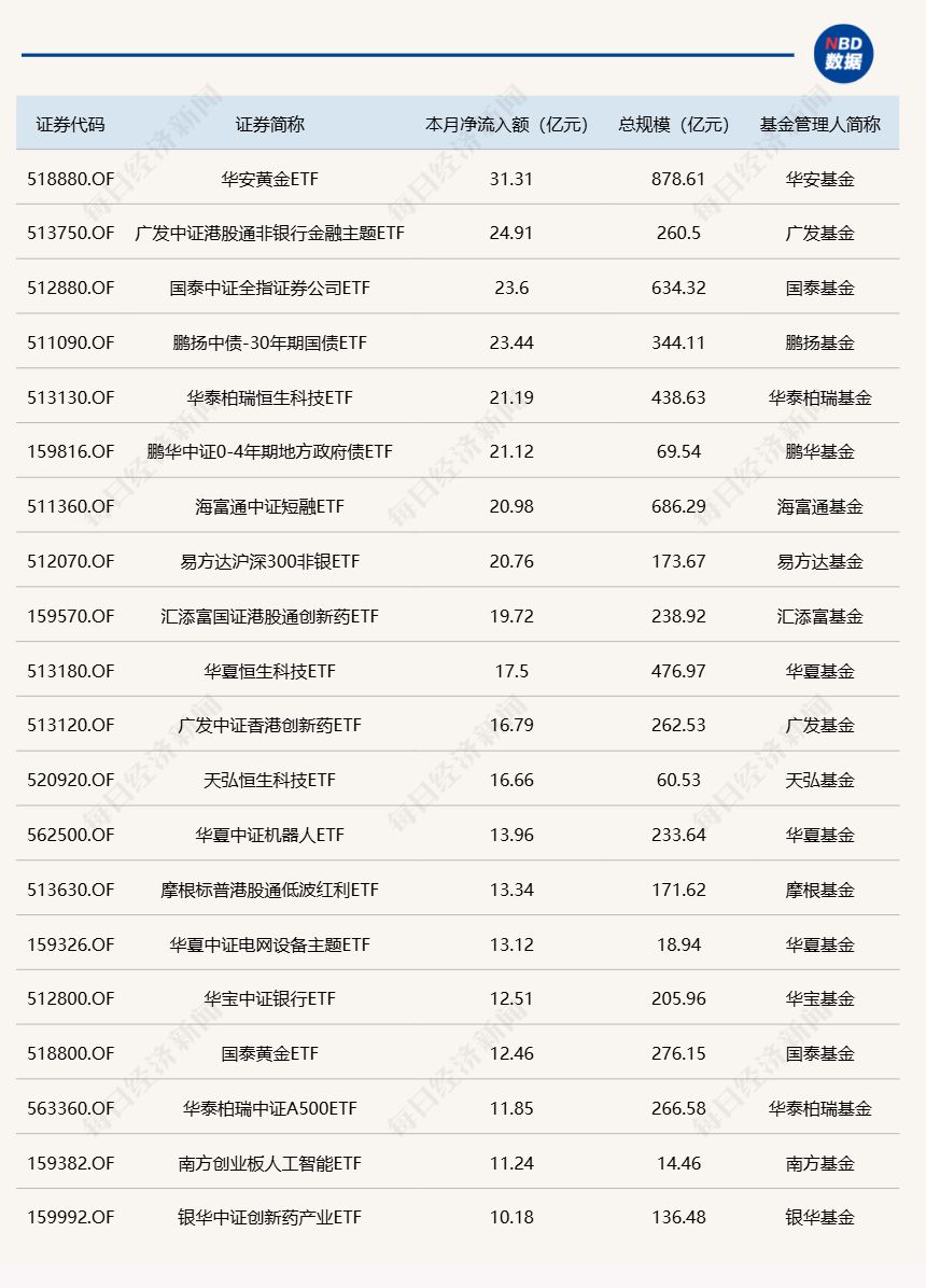 Wind 数据显示,在 11 月 13 日的非货币 ETF 市场中,南方创业板人工智能 ETF 基金份额增加 3.02 亿份,净流入额为 5.45 亿元;汇添富国证港股通创新药 ETF 基金份额增加 2.76 亿份,净流入额为 5.04 亿元;华安黄金 ETF 基金份额增加 0.54 亿份,净流入额为 4.97 亿元。