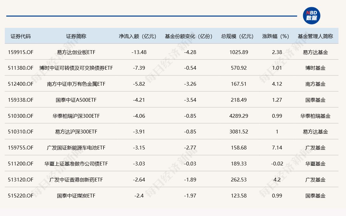 与此同时,易方达创业板 ETF 基金份额减少 4.28 亿份,净流出额为 13.48 亿元;博时中证可转债及可交换债券 ETF 基金份额减少 0.54 亿份,净流出额为 7.39 亿元;南方中证申万有色金属 ETF 基金份额减少 3.26 亿份,净流出额为 5.82 亿元。