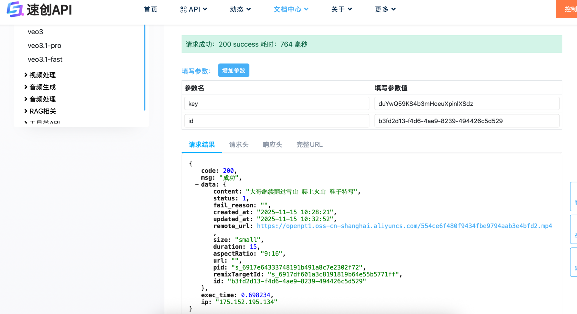提交任务后,若未立即返回视频链接,可通过返回的 id 调用 「任务状态查询接口」 轮询结果,直到 status 变为 1(成功) 或 2(失败)。