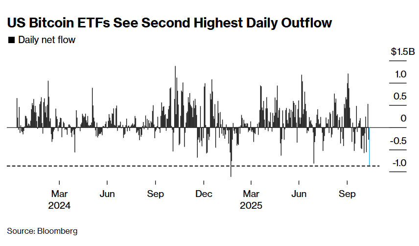 与此同时,比特币交易所交易基金 (ETF) 周四录得约 8.7 亿美元的净流出,为该类基金推出以来的第二大单日赎回规模。