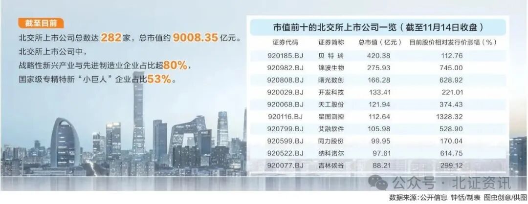 经过四年发展,北交所市场规模显著增长,截至 11 月 14 日,北交所上市公司总数达 282 家,总市值约 9008.35 亿元,迈向万亿元大关。根据证监会数据,北交所现有上市公司中,战略性新兴产业与先进制造业企业占比超 80%,国家级专精特新「小巨人」 企业占比达 53%,创新主体集聚效应明显。