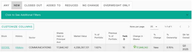 据披露,伯克希尔在第三季度建仓谷歌-A(GOOGL),买入将近 1785 万股,对应季末市值约为 43 亿美元,这是伯克希尔在第三季度买入最多的标的,也是唯一新增持股。