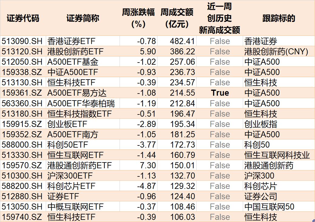 其中,香港证券 ETF 周成交额近 500 亿元。另外,本周 A500ETF 易方达成交额创历史新高。