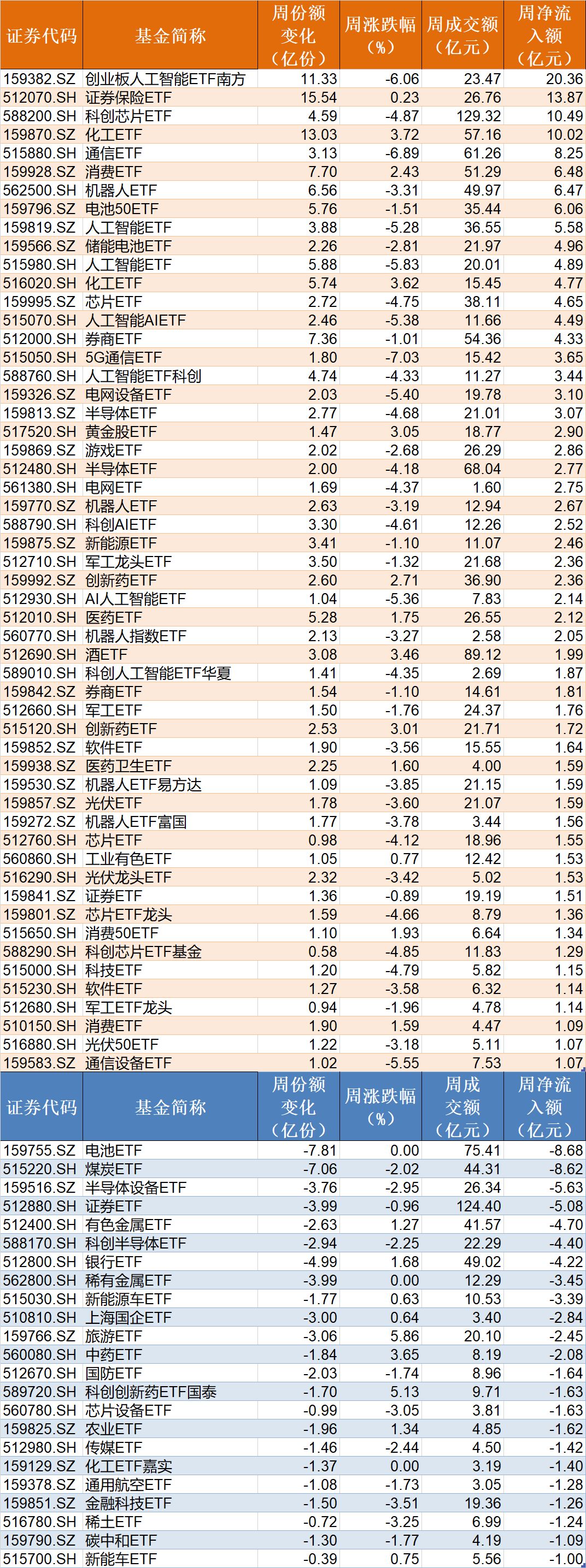 行业主题上看,人工智能、券商等 ETF 被资金看好,而电池、煤炭相关 ETF 被资金抛售。