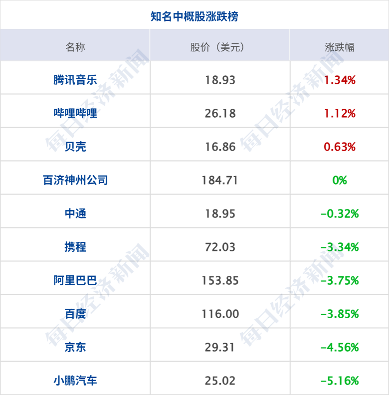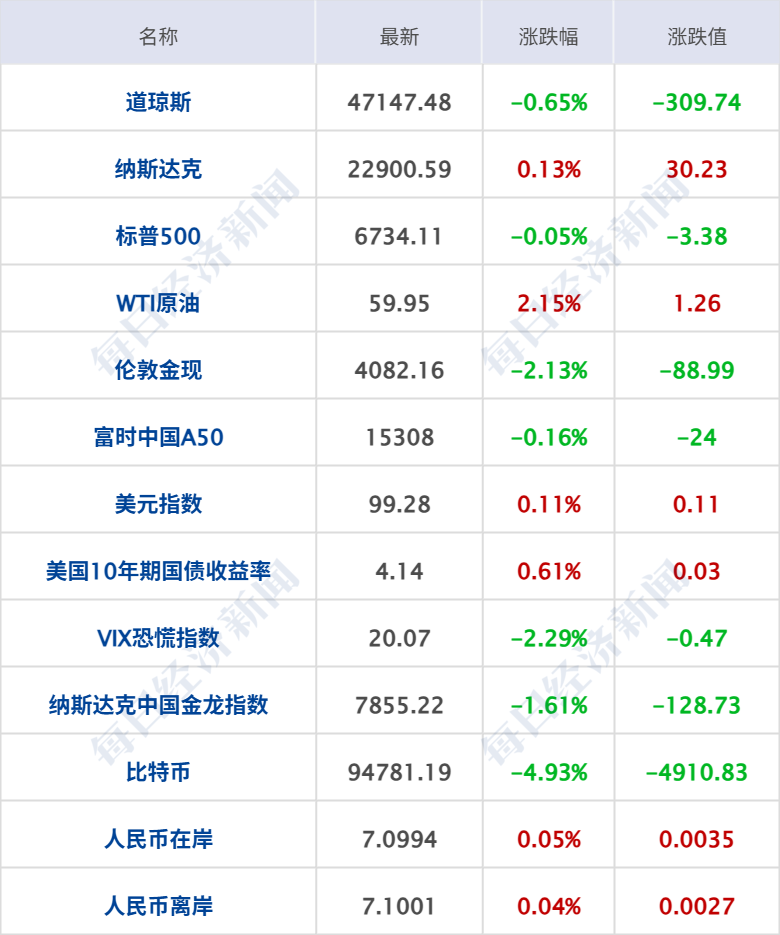 美股三大指数收盘涨跌不一,道指跌 0.65%,标普 500 指数跌 0.05%,纳指涨 0.13%;科技股涨跌互现,甲骨文涨超 2%,微软、英伟达涨超 1%,奈飞跌超 3%,英特尔、亚马逊跌超 1%。中概股多数下跌,纳斯达克中国金龙指数收跌 1.61%;富途控股跌超 7%,小鹏汽车跌超 5%,京东跌超 4%,阿里巴巴跌超 3%。