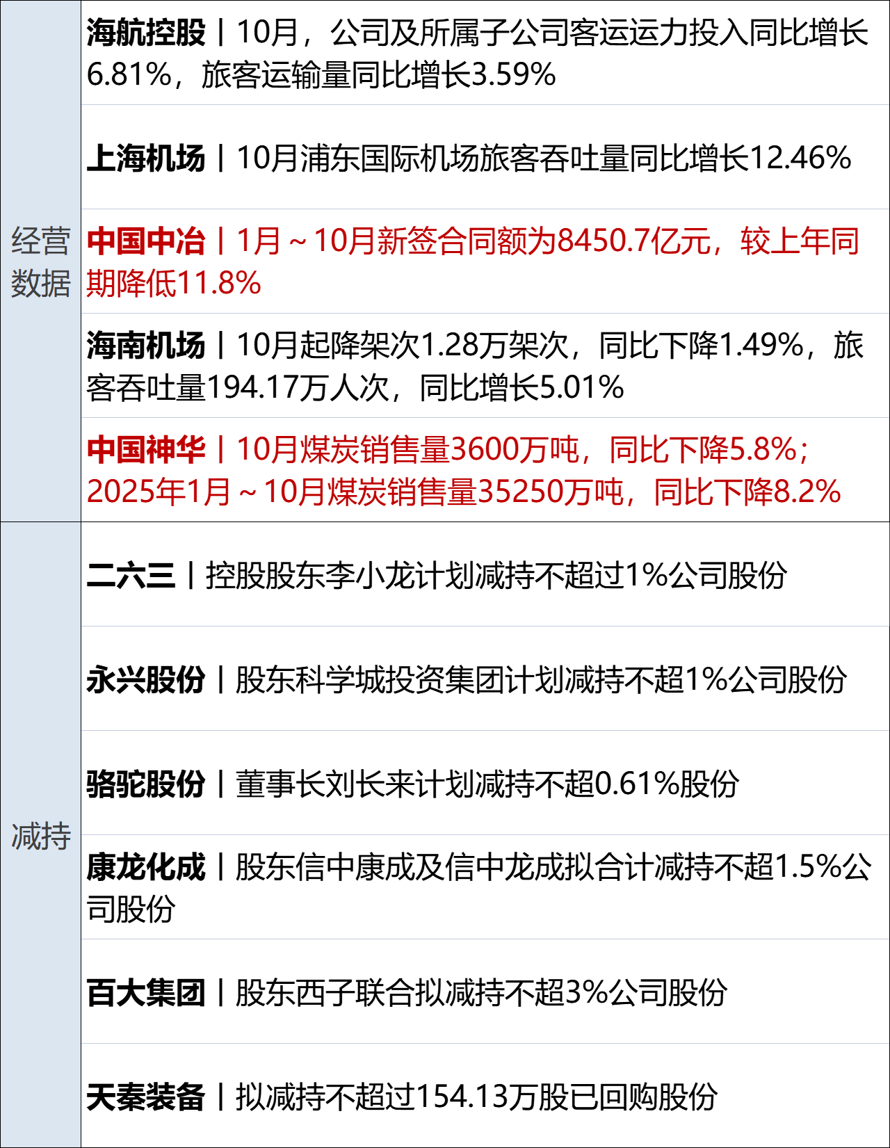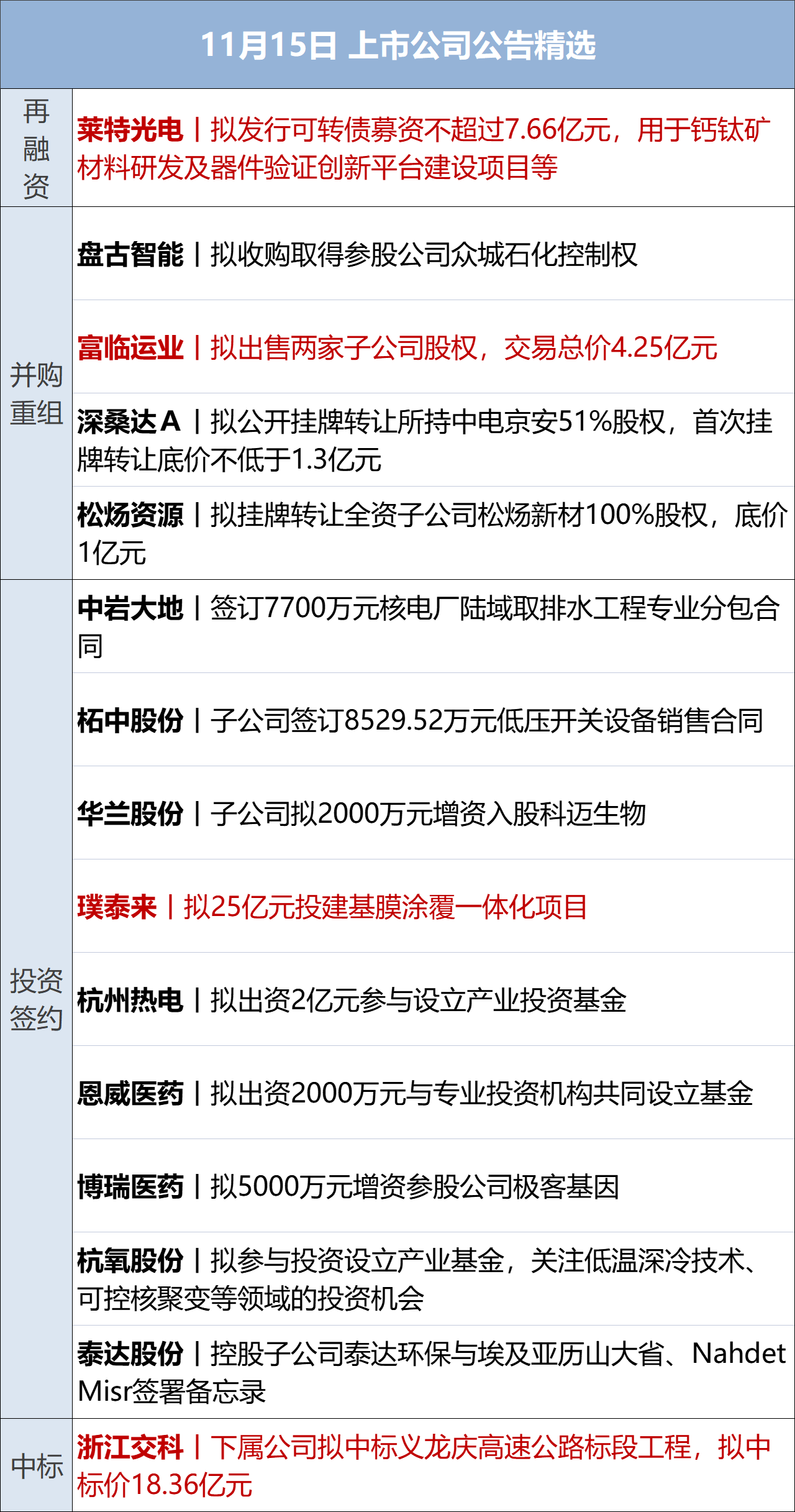宁德时代 (SZ300750,股价 404.12 元,市值 1.84 万亿元):11 月 14 日,宁德时代公告称,股东黄世霖计划通过询价转让方式转让 4563.24 万股股份,占公司总股本的 1%。此次转让不通过集中竞价交易或大宗交易方式进行,受让方在受让后 6 个月内不得转让。黄世霖直接持有公司 A 股股份 4.66 亿股,占公司总股本的 10.21%,其中 2.59 亿股为首发前股份。转让原因为自身资金需求。