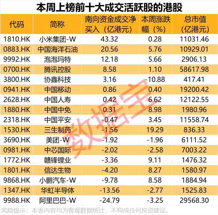 从行情上来看,前十大活跃个股中三生制药本周涨幅最高,达到 19.29%,赣锋锂业、小鹏汽车-W、信达生物紧随其后,分别上涨 9.11%、8.58%、8.27%。协鑫科技、药捷安康-B、潍柴动力跌幅居前,分别下跌 10.88%、7.6%、6.98%。