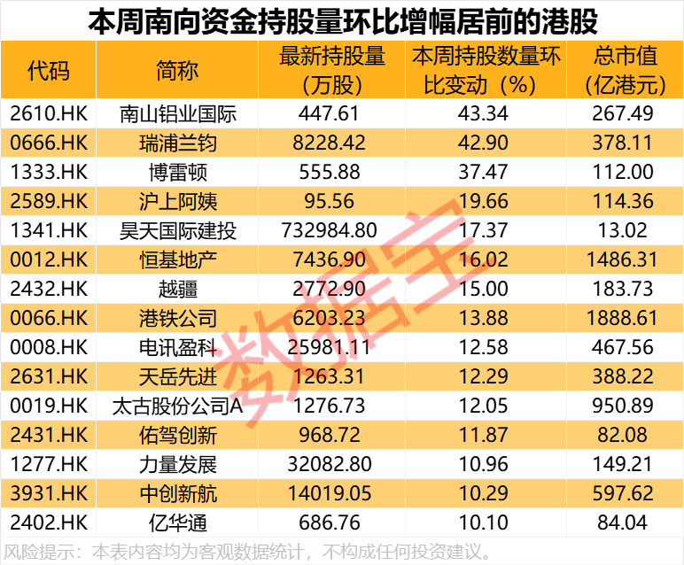 从持股量变化来看,本周 15 股获得南向资金持股量环比增长超 10%,南山铝业国际居首,环比增长 43.34%,其他还有瑞浦兰钧、博雷顿、沪上阿姨持股量环比增幅居前,持股量环比增幅分别为 42.9%、37.47%、19.66%。