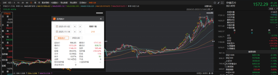 11 月 14 日,A 股存储芯片板块开盘大跌,热门概念股纷纷下跌。至收盘,同有科技、佰维存储、江波龙、普冉股份等 4 只个股跌幅超过 10%;康强电子、兆易创新、香农芯创、德明利等 13 只个股跌幅超过 7%。