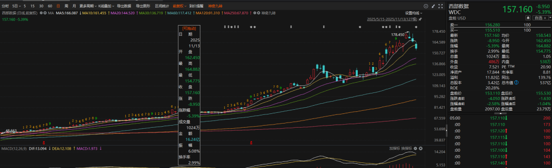 周四东京交易时段,铠侠控股股价仅下跌 1.62%,但其美股 ADR 暴跌引发美股存储板块连锁反应。11 月 13 日,西部数据跌 5.39%、希捷科技跌 7.31%、美光科技跌 3.25%。