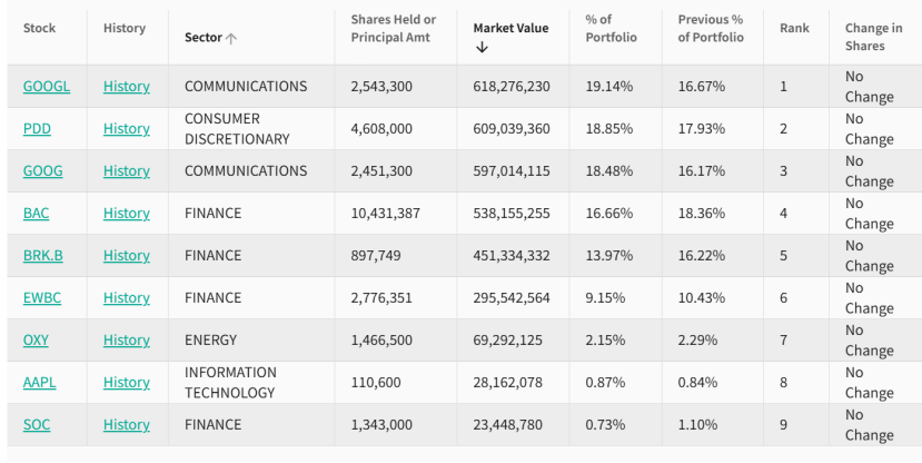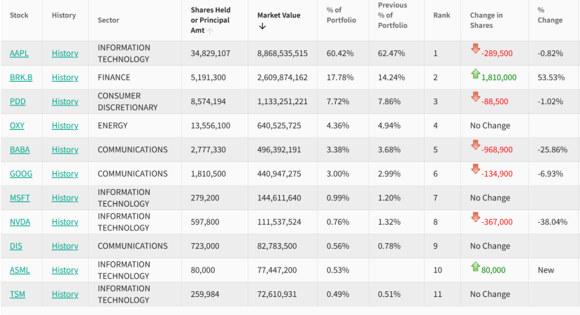 截至三季度末,H&H 基金的前十大重仓股分别为苹果、伯克希尔 B、拼多多、西方石油、阿里巴巴、谷歌、微软、英伟达、迪士尼、阿斯麦。其中,苹果仍然是第一大重仓,经历连续四个季度减持后,期末持股市值仍高达 89 亿美元,占总仓位的 60%。