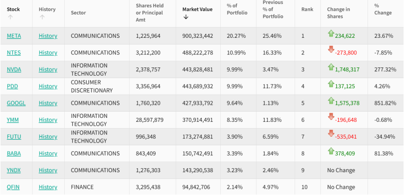 此外,被认为由段永平管理的 H&H International Investment 基金加仓伯克希尔,继续减持苹果;李录掌管的喜马拉雅资本则持股不动,依然重仓持有谷歌和拼多多。
