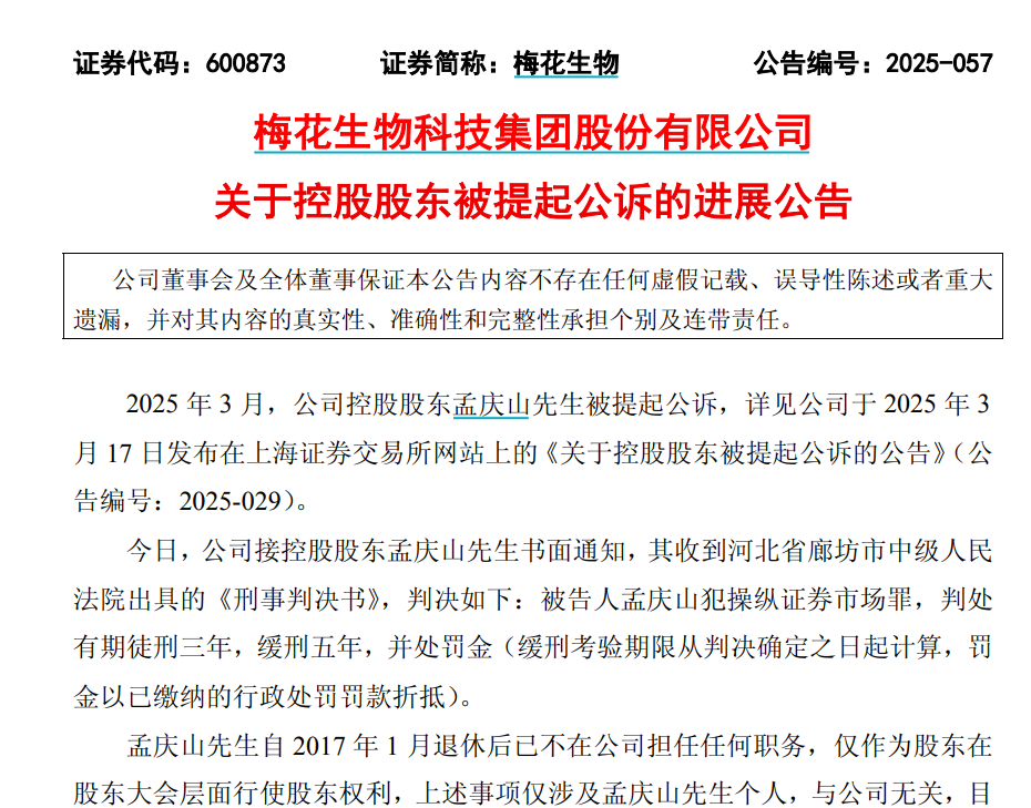 梅花生物发布公告称,2025 年 3 月,公司控股股东孟庆山被提起公诉。11 月 7 日,公司接到控股股东孟庆山书面通知,其收到河北省廊坊市中级人民法院出具的 《刑事判决书》,判决如下:被告人孟庆山犯操纵证券市场罪,判处有期徒刑三年,缓刑五年,并处罚金 (缓刑考验期限从判决确定之日起计算,罚金以已缴纳的行政处罚罚款折抵)。